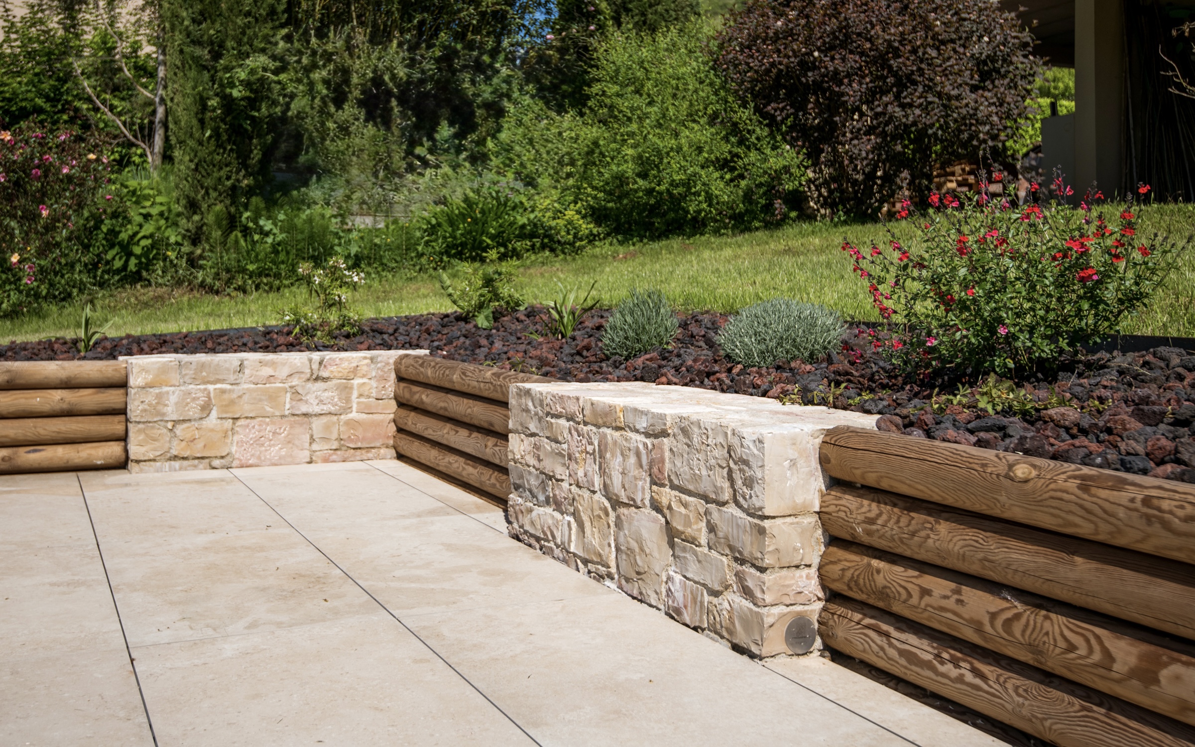 – un mur de soutènement d’1,2m de hauteur et d’environ 10ml de longueur, composé de 7 modules Cloturepierre et 6 travées de rondins de bois.